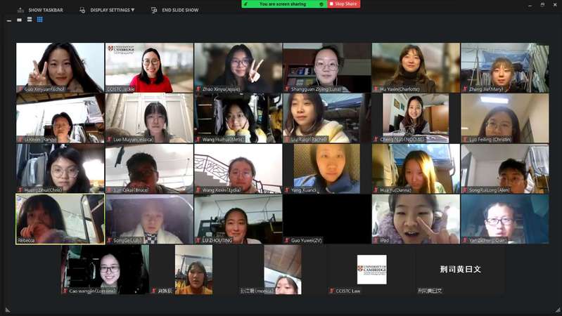 为鼓励学生与国(境外)高校进行学习交流,拓展国际视野,提升国际竞争力和科研实践能力,12月17日,我校2021年寒假英国剑桥大学科研注册生项目在线顺利开班。开班仪式由剑桥科文Jackie老师主持,经济法学院对外交流负责人汪雪苑老师及30名学员共同参与了本次活动。