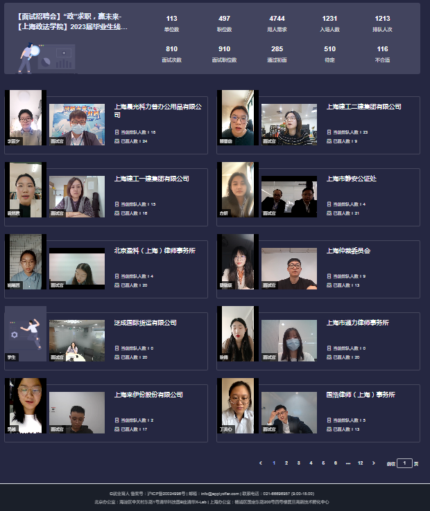 与往届招聘会相比,本次招聘会充分发挥了线上招聘的优势,招聘企业介绍更加详实,宣传动员更加充分,流程更加科学,面试更加便利。招聘会准备阶段校企之间进行了充分的沟通,企业的介绍和用人需求更加清晰明确;学校“上政发布”“上政就业”公众号同时发布招聘会推送,二级学院通过多种形式加大宣传动员;学生报名及简历投递的流程得以简化,调动了学生参会的积极性;招聘会为每一家用人单位开设了视频面试间和排队系统,提升了面试效率。
