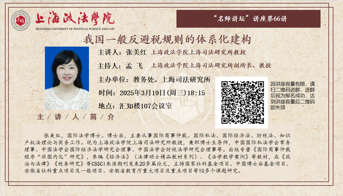 【名师讲坛第66讲】上海司法研究所张美红教授:《我国一般反避税规则的体系化建构》