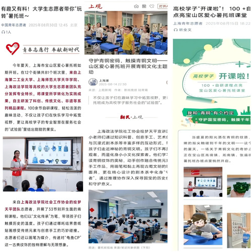 今年的暑期社会实践中,政府管理学院组织团队聚焦文化传承、乡村振兴、社会服务、基层治理等领域,通过实地探访、手工体验、宣讲活动、问卷调查等多元形式,深入走访调研上海市各区及贵州凯里等十余个省市地区。来自学院不同专业的团队成员融合各个专业特色,在文化传承中担任“非遗守护者”,如开展暑托班青铜纹饰课程、金山农民画推广;在乡村振兴中充当“产业转型探路者”,如探研练塘镇红旅融合、沈杨村生态重构;在基层治理中化身“政策建言者”,如聚焦立法参与、区村衔接优化等,切实将专业知识转化为服务社会的实际行动,让青春答卷在大地深处熠熠生辉。