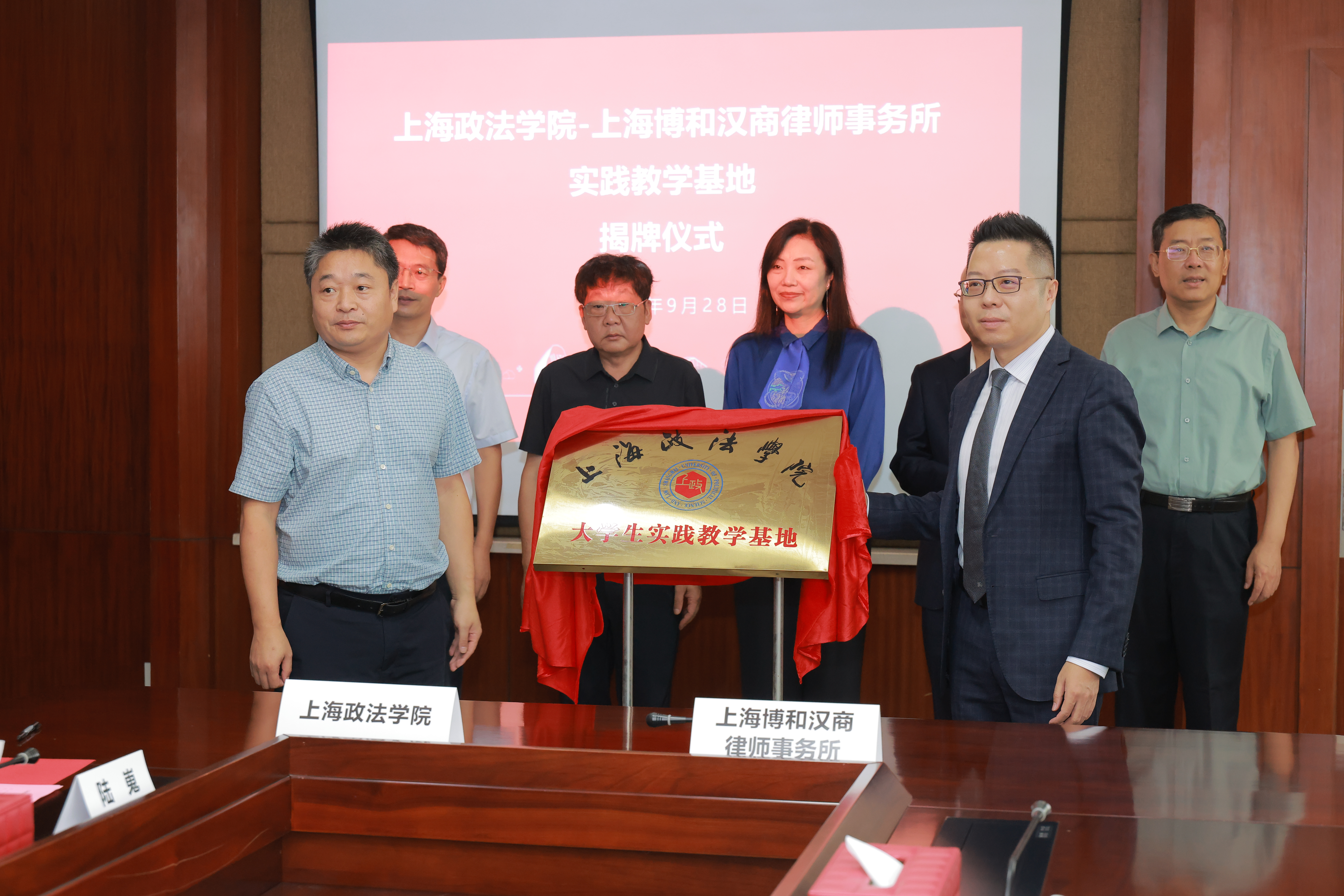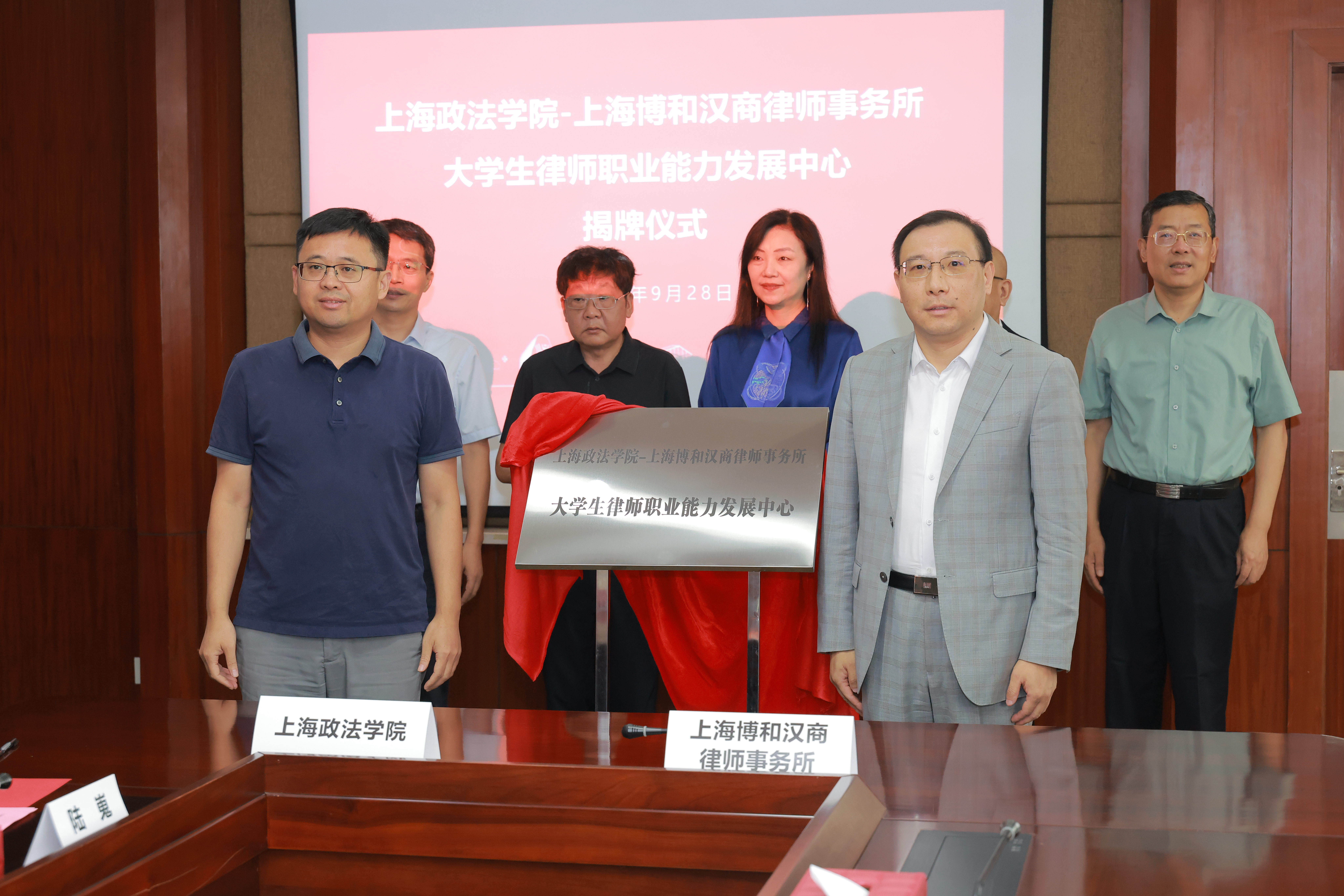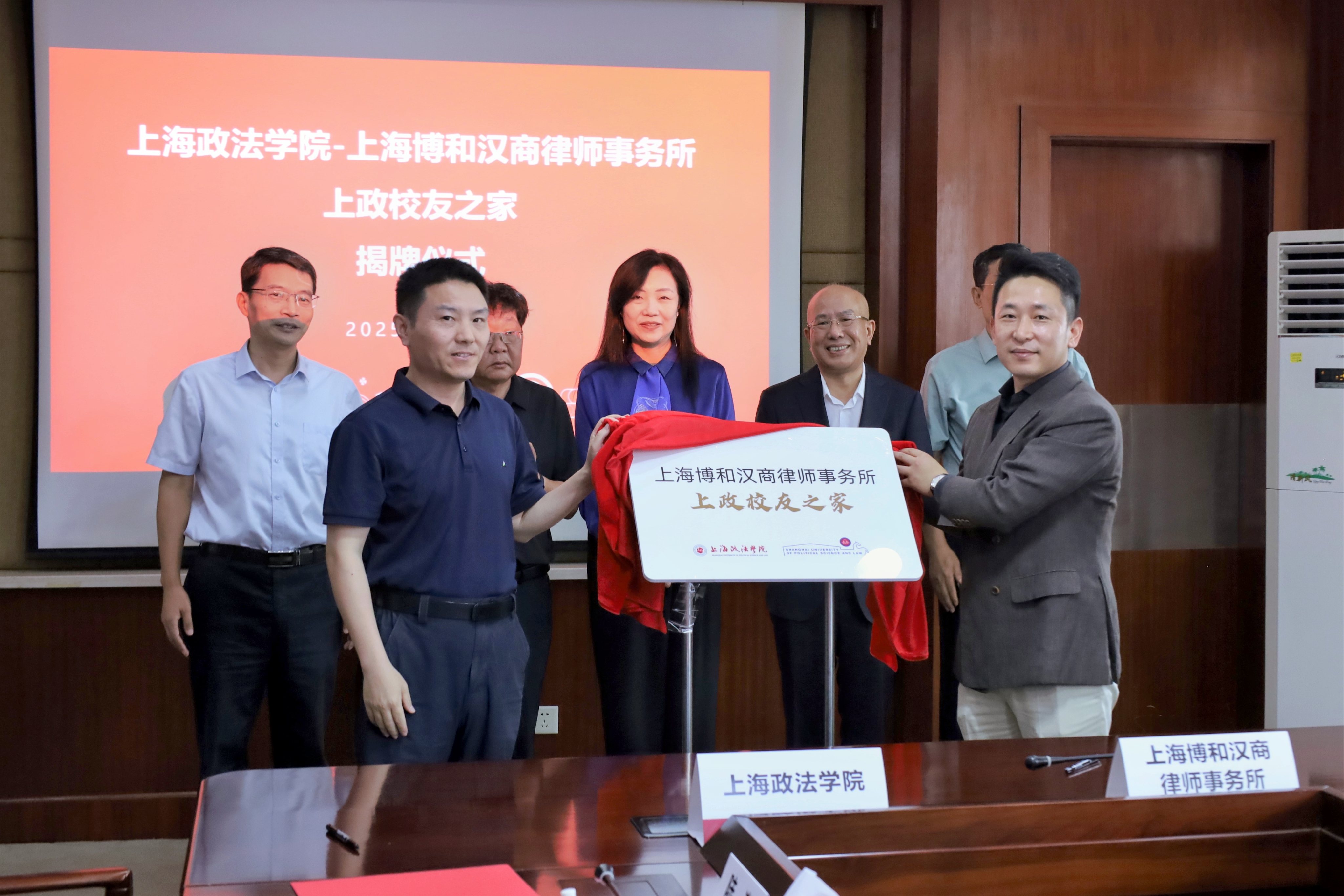 研究生处处长卫磊和朱海峰共同为“上海博和汉商律师事务所上政校友之家”揭牌。