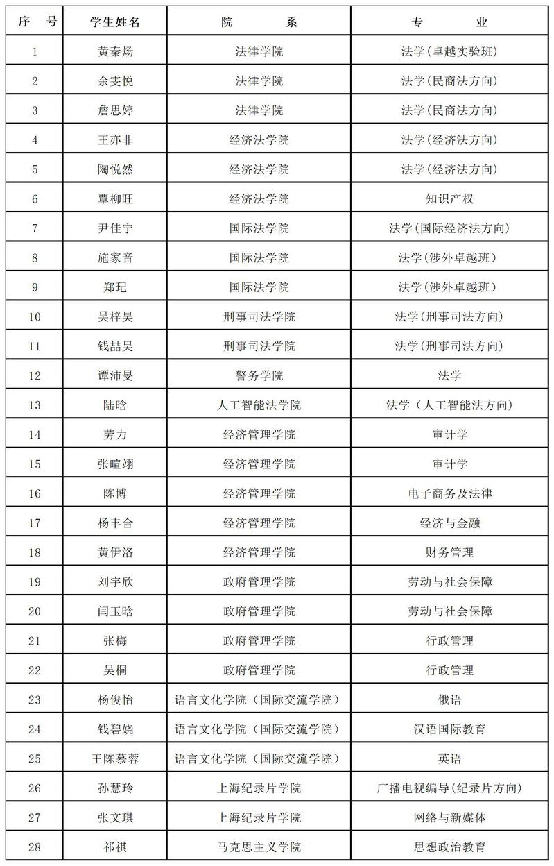 根据上海市教委相关通知要求和《关于印发〈上海政法学院本科生国家奖学金、国家励志奖学金和上海市奖学金评审实施办法〉的通知》(沪政院学〔2020〕120号)、《上海政法学院关于调整政府奖学金和校长奖学金资助政策的通知》(沪政院学〔2025〕111号)规定,经学生本人申请、二级学院初审、学(研)工部(处)学生资助奖励中心复核、校学生工作指导委员会集体评审通过,现将本校2024—2025学年本科生国家奖学金拟推荐名单进行全校公示。