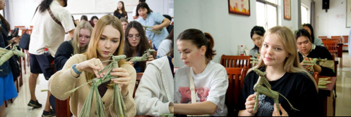 在茭白叶编织展示厅,中外学生开展“茭白叶变形记”体验。作为“茭白之乡”,练塘镇将收割后废弃的茭白叶转化为精美艺术品的生态智慧,让留学生们惊叹不已。非遗传承人先讲解茭白叶处理流程与环保理念,再示范基础编织技法。留学生们跃跃欲试,跟着步骤折叠、缠绕,遇到困难便向身边的中国学生请教。