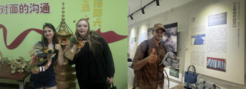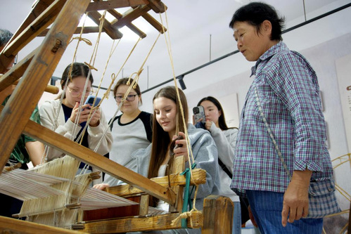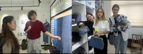 在江南土布制作展示厅内,当地非遗传承人向中外学生展示了古老的纺车、织布机等实物工具,用生动的语言讲述江南土布数百年的发展历程——从棉花到成布,纺纱、染纱、经布、织布等每一道工序都凝聚着古人的智慧。留学生们认真聆听不同土布纹样背后的文化寓意,积极向传承人提问,深入了解这项传统技艺的传承现状。