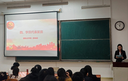 国际法学院学生薛雨晴作为学员代表发言。薛雨晴表示,理论学习并非可有可无的“附加项”,而是支撑党员坚定理想信念、提升政治素养、明晰行动方向的核心基础,更是从“思想上入党”向 “行动上入党”深化的根本前提。薛雨晴分享了自己参与培训的态度:一是要“虚心”,放下“已经入了党就足够”的松懈心态;二是要“用心”,坚持学思用贯通、知信行统一;三是要“恒心”,力争筑牢常态化学习根基,把所学转化为服务同学、建设校园的实际行动。