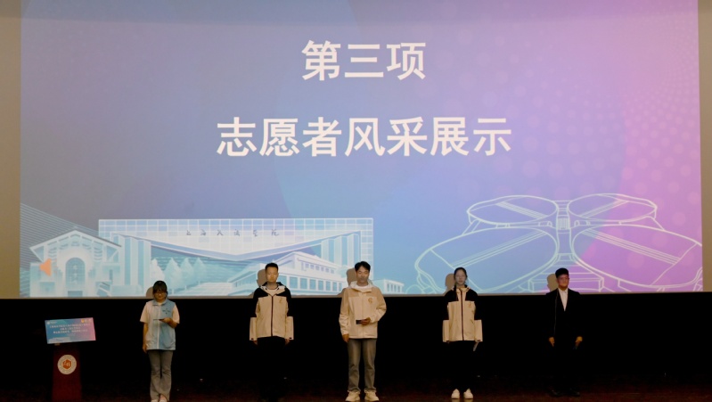 仪式上,短片《直击进博》播放了后续批次志愿者送上的诚挚祝福与热情鼓励,展现了进博志愿服务团队薪火相传的奉献精神,通过短片走近志愿者们充满青春蓬勃朝气的志愿服务工作,在场师生深受触动,“奉献、友爱、互助、进步”的志愿精神在此刻具象化,激励着新一届“小叶子”拼搏、进取,再出发!