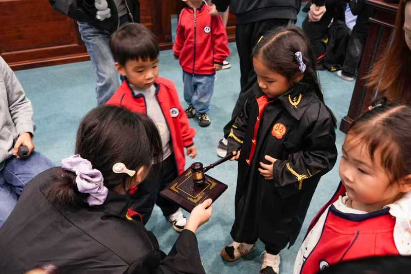 在明法苑B4模拟法庭,学生志愿者按照剧本演绎关于防拐骗的模拟庭审,引导儿童感受法律的严肃性与安全性,培养规则意识与自我保护能力。在互动环节中,儿童们通过多种形式成为“法治小主人”,有的亲身扮演法官角色,敲法槌感受法律威严;有的参与“交通规则大冒险”,根据红绿信号灯指示模拟过马路,齐声跟读安全口诀;还有的在“防拐骗情景模拟”中,果断拒绝“陌生人”的诱惑,学会自我保护。整个过程中,现场志愿者耐心讲解、全程护航,让法治意识深入人心。