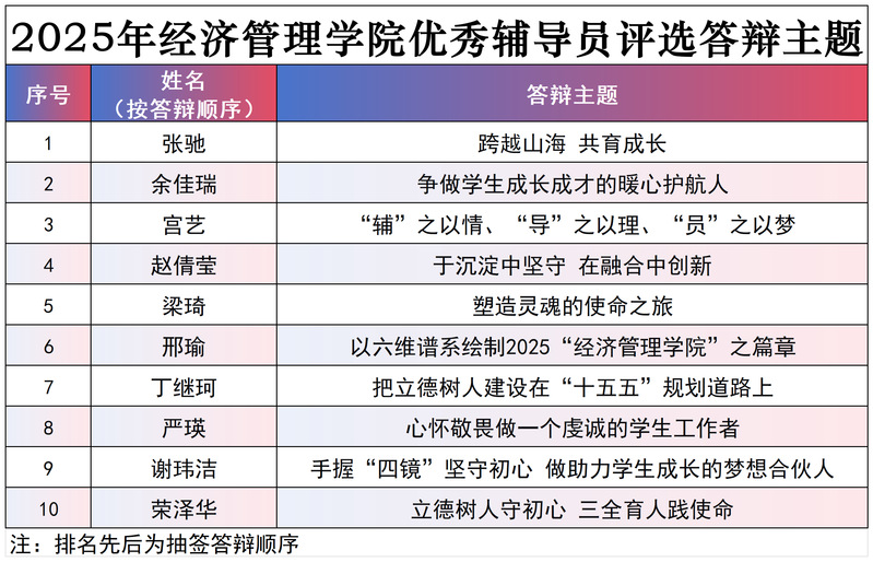 本次优秀辅导员评选答辩会,既是对过往育人实践的系统梳理,更标志着辅导员队伍朝着专业化、专家化方向迈出坚实一步,为学院“第四支队伍”的建设注入了新动能、明确了新方向。学院将持续依托这一平台,锤炼学工队伍能力,深化育人模式创新,使其成为促进团队成长与专业发展的重要载体。