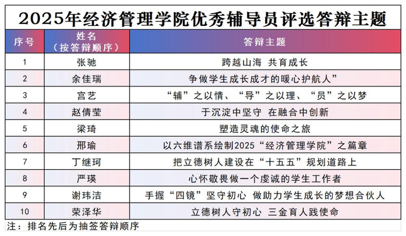 本次答辩会不仅是一次优秀典型的评选,更是一场深度的工作交流与思想碰撞。十位辅导员依次进行述职答辩,围绕工作理念、举措、特色与成效展开汇报。答辩内容涵盖学生思想政治引领、日常事务管理、学风建设、职业规划指导及专项工作创新等方面,全面呈现了学院辅导员扎实的业务能力、饱满的工作热情与系统的育人思考。