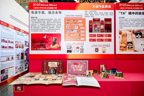 本届大赛过程中,我校参赛项目捷报频传、亮点纷呈。学(研)工部(处)“唯实”宣讲团报送的《电波不逝,信念永存》,不仅斩获文创作品赛道一等奖,更以独特创意赢得广泛认可,获评“最佳人气奖”,指导老师颜涵获评“优秀指导老师”。“唯实”宣讲团继去年拿下“红色文化传播者赛道”一等奖后再度折桂,有力彰显了其在红色文化创意领域的扎实积累与持续创新能力。此外,政府管理学院《榅桲有语系列文创包装设计》获评沪疆文化交流专项赛道三等奖,经济管理学院、上海纪录片学院(法治宣传教育学院)报送的3个项目均获优胜奖。
