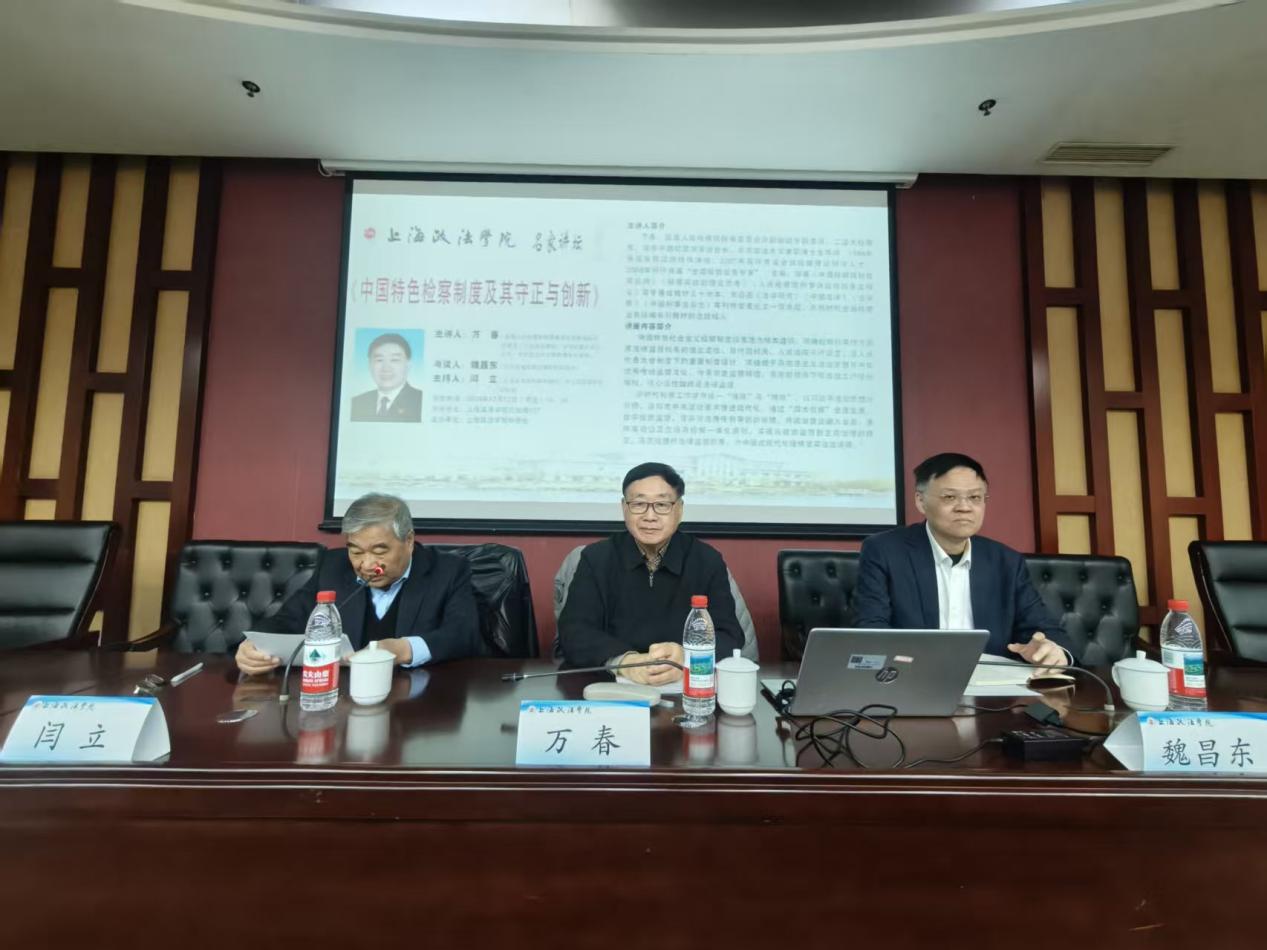 12月12日下午,上海政法学院“名家讲坛”系列的第256讲在汇知楼107会议室成功举办,最高人民检察院检察委员会原副部级专职委员、二级大检察官、中国犯罪学学会会长万春教授以“中国特色检察制度及其守正与创新”为题,为在场师生们带来了一场引人入胜的学术演讲。讲座由原上海政法学院副校长闫立教授主持,华东政法纪检监察学院副院长魏昌东教授与谈。