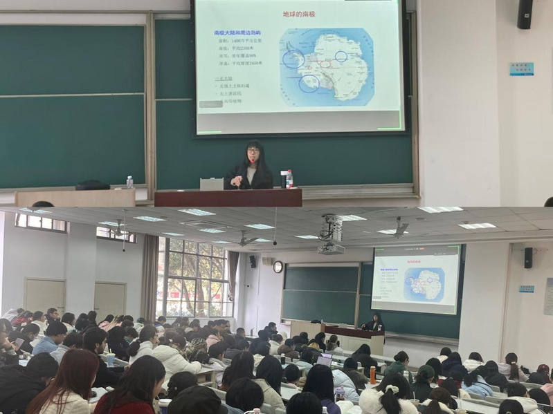 讲座伊始,单琰焱以“极地冷知识大挑战”活跃现场气氛。“南极和北京的时差是多少?”“科考队员在南极能吃到新鲜蔬菜吗?”同学们踊跃抢答,在轻松互动中增进了对极地的了解。