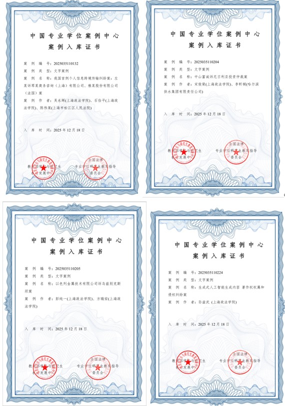 近日,全国法律专业学位研究生教育指导委员会公布了第五批法律硕士专业学位文字教学案例评审结果。我校提交的五项法律硕士专业学位教学案例成功入选,入选数位居前茅。分别为吴永辉教授团队撰写的《我国首例个人信息跨境传输纠纷案:左某诉琴某商务咨询(上海)有限公司、雅某股份有限公司(法国)案》,系我国第一例涉及个人信息跨境传输的司法裁判,首次从涉外司法法律适用的层面明确了个人信息合法跨境传输的具体认定标准;宋俊荣副教授团队撰写的《中山富诚诉尼日利亚投资仲裁案》,聚焦中国企业出海权益保护,深度剖析国际投资仲裁中的关键法律问题;彭纯一老师团队撰写的《以色列金属技术有限公司诉乌兹别克斯坦案》,聚焦腐败问题在投资仲裁中的法律地位与裁判机制,深度剖析仲裁庭在面对腐败指控时的审查标准、推定方法及裁判结果的制度影响;孙益武副教授撰写的《生成式人工智能生成内容著作权权属和侵权纠纷案》,总结提炼中国本土的生成式人工智能著作权保护司法实践,深度分析了生成式人工智能著作权保护中的基础理论和程序配置;李小林老师撰写的《远洋集团控股有限公司跨境破产案》,聚焦我国房地产企业赴境外法院择诉实践,剖析我国破产法领域推进涉外法治的制度障碍与现实需求。
