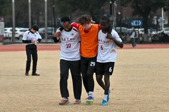 当比赛进行至下半场第40分钟时,激烈的拼抢中,中国学生队一名球员不慎受伤倒地。凌云足球队的球员们几乎同时停下脚步,纷纷主动走向倒地的对手。有人询问伤势,有人示意支援,在双方球员共同的搀扶与守护下,缓缓将他转移至场边接受治疗。没有隔网般的对立,没有竞技的焦躁,绿茵场在这一刻成了共享关怀的共同体。