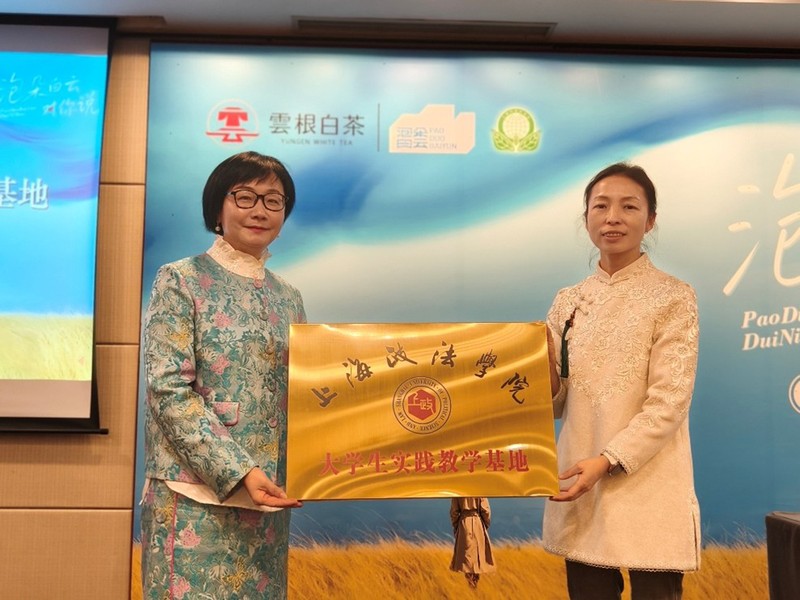 随后,在与会嘉宾的共同见证下,语言文化学院(国际交流学院)与福建省政和云根茶业有限公司举行了合作协议签约仪式,语言文化学院(国际交流学院)党总支副书记(主持工作)周怡向福建省政和云根茶业有限公司董事长许益灿、总经理叶雄英颁发茶文化实习实践导师聘书,并共同为“上海政法学院大学生实践教学基地”揭牌。