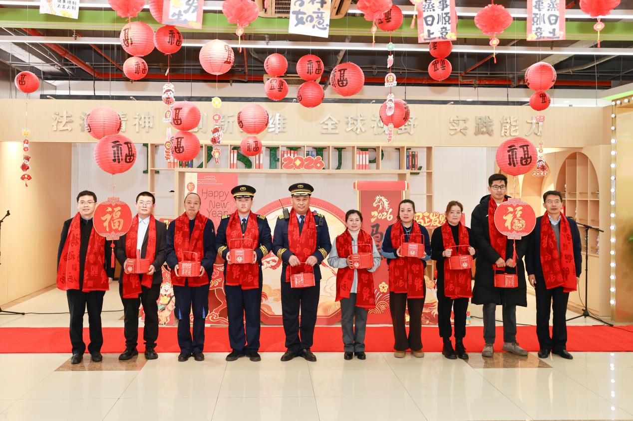团圆宴仪式上,葛卫华书记、郑少华校长为留校学生发放了新春礼包,送上了学校的亲切关怀。高志刚副书记、毛军权副校长向假期坚守岗位的工作人员代表发放了新春礼包,感谢他们用坚守保障了校园平安有序。上政学子们向佘山镇政府和学校敬献了满载学生祝福心意的新春福桶。