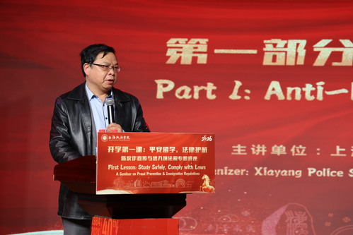本次讲座由上海市青浦公安分局夏阳派出所陈天喜警官、上海市公安局出入境管理局赵坤警官分别担任主讲。武装保卫部(处)部长潘高荣、副部长蒋存耀,学生工作部副部长、留学生工作办公室副主任闯晓燕,各二级学院学生辅导员和40位安全专管员及学生共200余人参加。