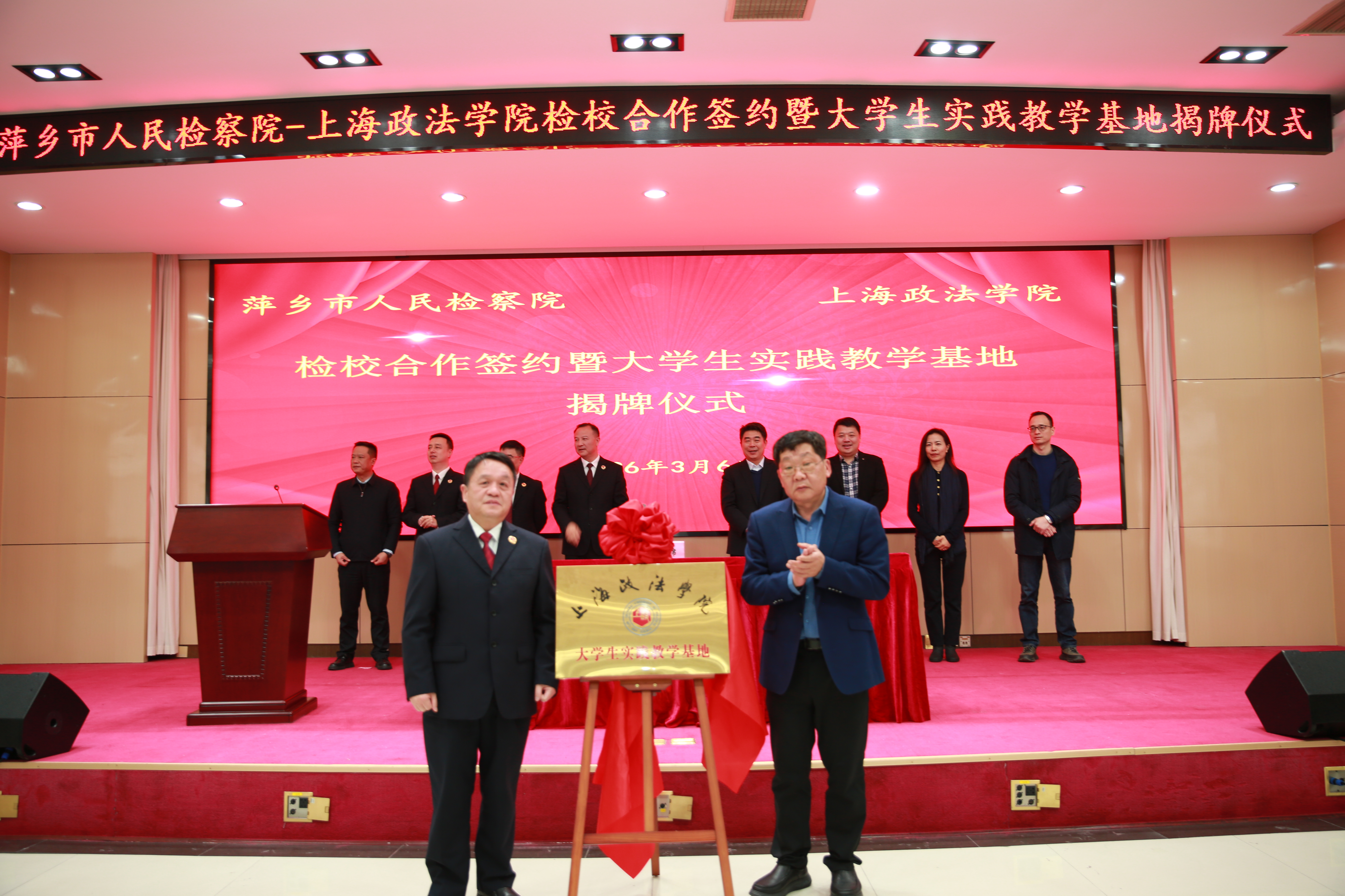 在全场共同见证下,上海政法学院与萍乡市人民检察院双方代表正式签署检校合作协议,并共同为上海政法学院大学生实践教学基地揭牌,标志着双方合作迈入崭新阶段,开启了法学教育与检察实践深度融合、双向赋能的新篇章。