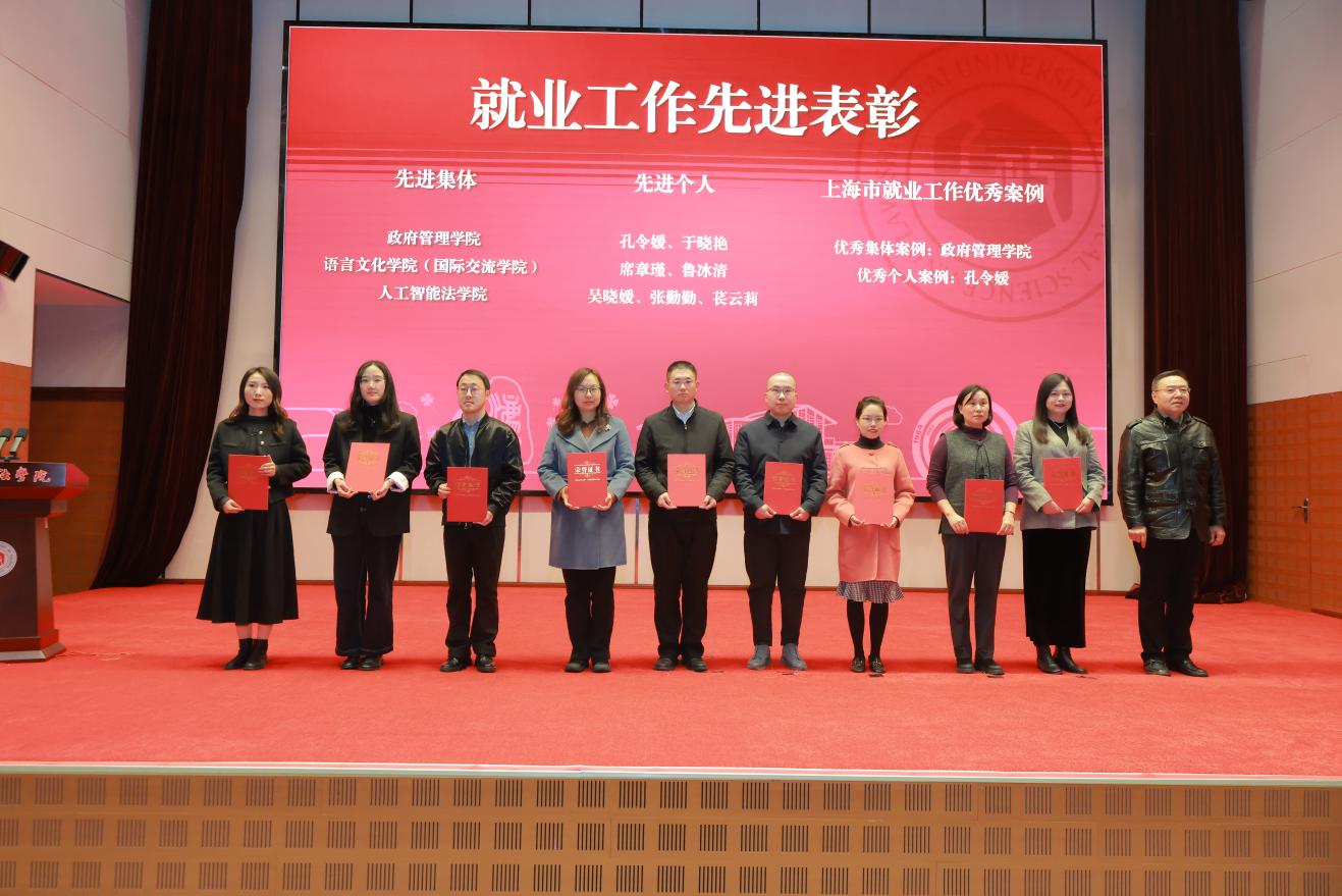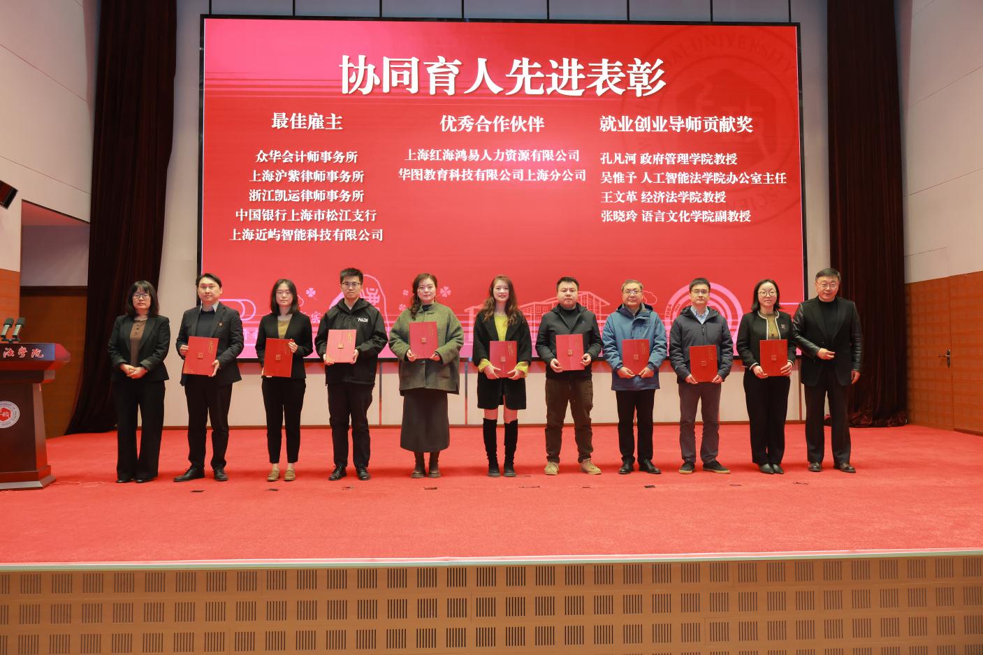 表彰环节,校党委副书记、纪委书记、监察专员潘牧天为“就业工作先进集体”“先进个人”及获得上海市就业工作优秀案例的单位和个人颁发了荣誉证书。校党委常委、组织部部长刘志强,校党委常委、宣传部部长张东霞为“最佳雇主单位”“优秀合作伙伴”及“校级优秀就业创业导师”获奖代表颁奖。