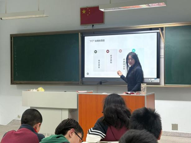 志愿者罗烨婷同学则以2026年春晚爆款节目《贺花神》为引,借助资料与唯美节目视频,层层拆解节目背后的文化底蕴与艺术巧思,系统梳理节目所承载的中华花文化、传统服饰美学、古典诗词典故与现代科技赋能的创新融合。生动细致的讲解深深吸引了在场同学,大家专注聆听、积极互动,在传统文化与现代审美的碰撞中感受东方美学的独特韵味。她呼吁同学们以“种花人”的姿态,主动投身中华优秀传统文化的创造性转化与创新性发展,以青春创意赋予传统文化新的生命力,积极参与中华文化国际传播,让世界听见中华文脉花开的声音。