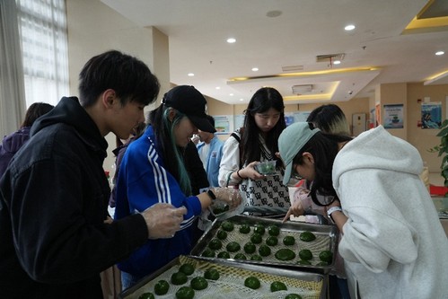 活动伊始,翠绿的艾草泥、雪白的糯米粉、绵密的豆沙馅整齐摆放,食堂工作人员细致讲解青团的制作方法与民俗内涵。青团是江南清明标志性美食,也是民俗中“尝春、祭春”的重要载体,承载着慎终追远的文化意蕴与迎接春日生机的美好寓意。师生们挽起衣袖,认真投入制作。初次尝试的同学略显生涩,在指导与互助下渐入佳境;手法熟练的同学创意十足,很快便做出圆润饱满、碧绿如玉的青团。指尖揉搓间,传统手艺的温度、劳动实践的乐趣与南方民俗的魅力融为一体。