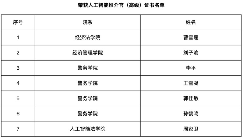 为积极响应国家“人工智能+”行动号召,落实上海市全员人工智能技能素养提升战略,我校人工智能人才培养取得新突破。近日,从上海市人力资源和社会保障局、上海市教育考试院传来喜讯:我校曹雪莲等7名同学在2025年“上海高等学校信息技术水平考试”中表现优异,通过相关人工智能科目测评,成功获得由上海市人力资源和社会保障局、上海市教育委员会联合监制的“人工智能推介官(高级)证书”。