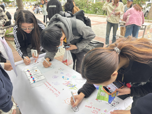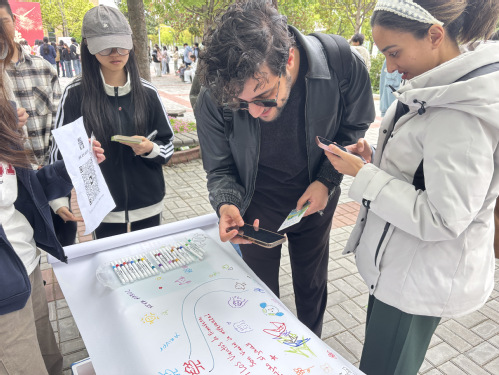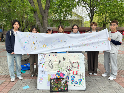 除作品展览与投票外,现场还设置了丰富的互动体验区。在植物拓印摊位,同学们亲手敲打叶片与花瓣,将春天的纹理留在素净的布面上;在集体彩绘长卷前,大家并肩执笔,共绘斑斓春色。值得一提的是,多位国际学生也被这场春日文化雅集吸引,主动参与拓印体验,在画卷上留下自己国家的春日光影,让不同文化的春日意趣在画布上相遇交融,尽显文化交流之美。