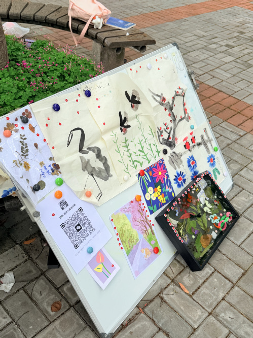 活动筹备期间,学院广泛收集了以“春天”为主题的原创艺术作品,并于活动当天在青马广场有序陈列展出。水彩画作明快清新、植物拓印质朴自然、创意拼贴精巧别致,每一件作品都生动诠释着创作者眼中的春日浪漫与生机。来往的同学纷纷驻足欣赏,手持小红花为心仪作品投票,朵朵红花点缀画框,恰似盎然春意在大家心中悄然绽放。