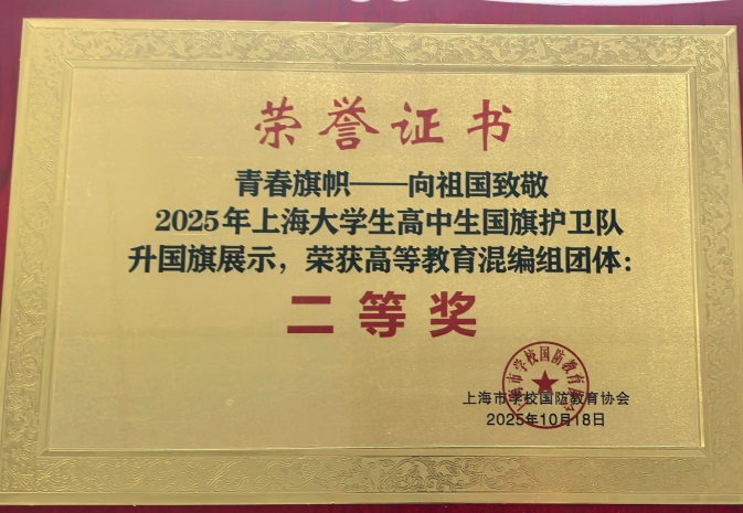 2025年10月18日,来自全市的三十支大学生与高中生国旗护卫队齐聚华东理工大学附属闵行科技高级中学,共同参加“青春旗帜向祖国致敬”2025年上海大学生高中生国旗护卫队升国旗展示活动。我校国旗护卫队凭借出色表现,在激烈角逐中荣获二等奖!