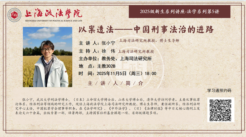 【2025级新生系列讲座-法学系列第5讲】上海司法研究所张小宁教授:以案透法——中国刑事法治的进路
