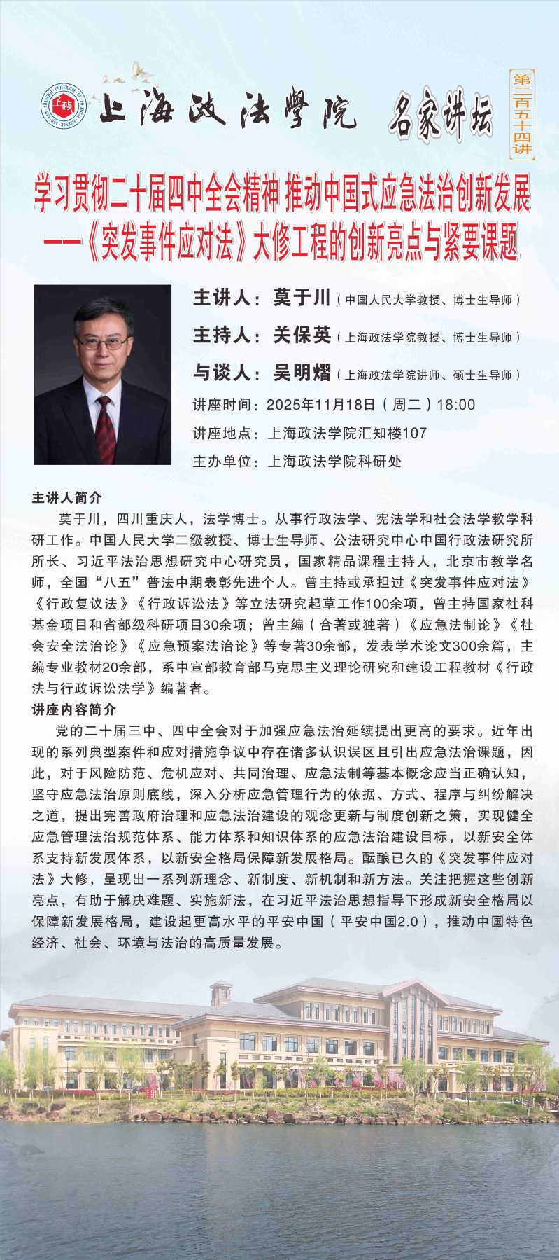 【名家讲坛第254讲】中国人民大学教授莫于川:学习贯彻党的二十届四中全会精神 推动中国式应急法治创新发展——《突发事件应对法》大修工程的创新亮点与紧要课题