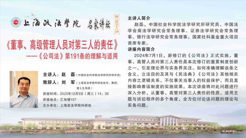 【名家讲坛第258讲】中国社会科学院法学研究所研究员赵磊:董事、高级管理人员对第三人的责任——《公司法》第191条的理解与适用