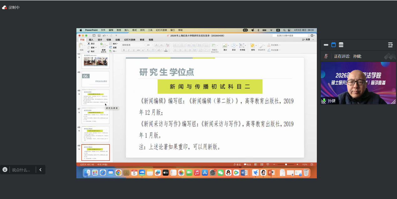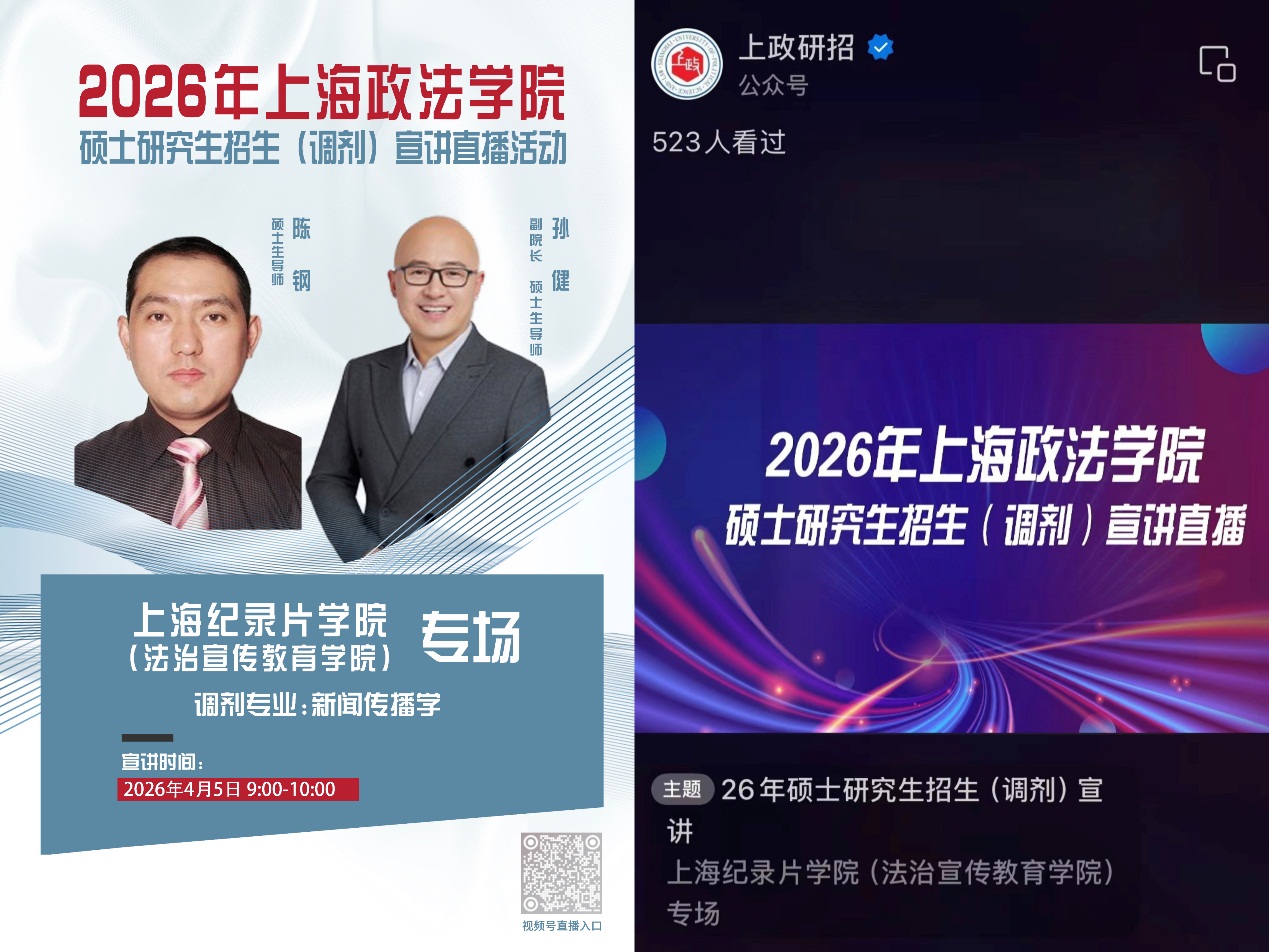 4月5日,上海纪录片学院(法治宣传教育学院)在学校研究生处的指导下通过线上直播平台成功举办2026年硕士研究生招生(调剂)宣讲活动。本次直播主要聚焦新闻传播学调剂专业,由副院长孙健、硕士生导师陈钢担任主讲,吸引了523名考生在线收看。