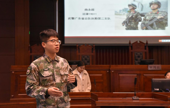 曲永超,曾服役于武警广东省总队执勤第二支队,现就读于法律19011班。他提到两年的军旅生涯锤炼了他的品格,改变了他的性格,锻炼了他的本领,更让他感受到集体力量的伟大。他讲解了当下国家对入伍大学生的种种优惠政策以及退伍后的种种安置措施,鼓励大家放下顾虑,携笔从戎。