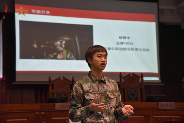 杨青宇,曾服役于广东省公安边防总队第五支队,现就读于法律18024班。他为到场的各位同学讲述了应征入伍体检前所应注意的种种问题,分享了刻骨难忘的军旅路上,军人们背负着使命和荣光,在摸爬滚打中磨炼自我,经历凤凰涅槃般的蜕变。