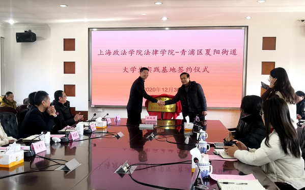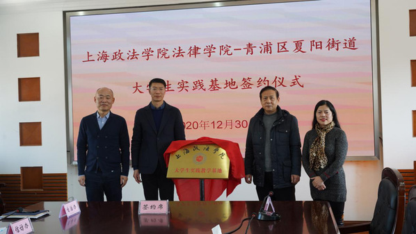 12月30日上午,法律学院与青浦区夏阳街道办事处举行大学生实践教学基地签约揭牌仪式。夏阳街道党工委书记、人大工委主任凌敏,党工委副书记、办事处主任徐川,党工委副书记肖飞、任建荣,党工委委员、武装部部长黄巍峰,党工委委员、总工会主席陈露露,办事处副主任邹梅、盛钢,法律学院院长侯怀霞教授、党总支书记文立月、党总支副书记陆嵬、辅导员张露、买雨佳、董敏维出席了本次签约揭牌仪式,仪式由肖飞主持。
