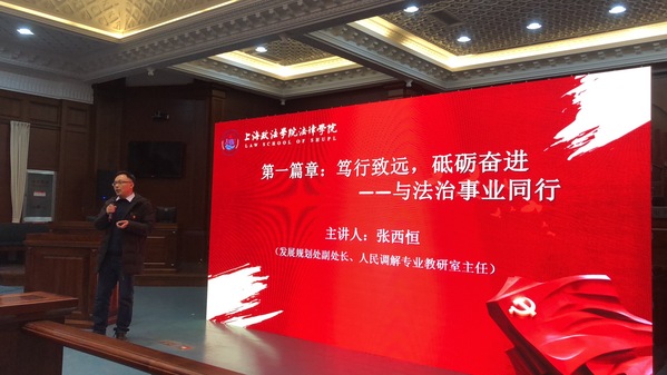 发展规划处副处长(挂职)、法律学院人民调解专业教研室主任张西恒以“笃行致远,砥砺奋进——与法治事业同行”为主题展开第一篇章,他带领全体党员回顾了新中国成立以来党的法治事业,并结合自身经历,激励大家坚守初心使命,矢志不渝的捍卫法律精神,砥砺前行。