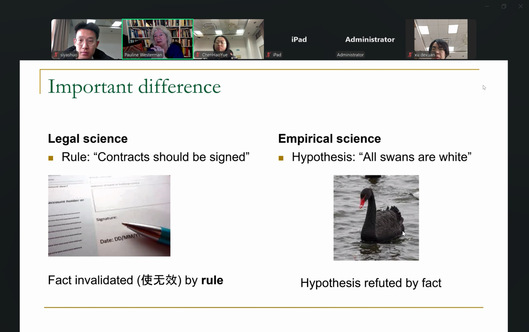 在比较研究模块,Pauline教授以“侵权行为”“私有财产”等概念为例,指出语言相同未必含义一致。例如,欧洲法律中“公共场所”可能排除某些名义上开放但实际受限的空间,而亚洲法律则可能更注重实际可达性。她提出:“比较法研究需穿透语言表象,深入分析规则背后的条件框架——条件不同,则概念不同。”通过“白天鹅假说”类比,阐释实证研究对法学理论修正的意义。
