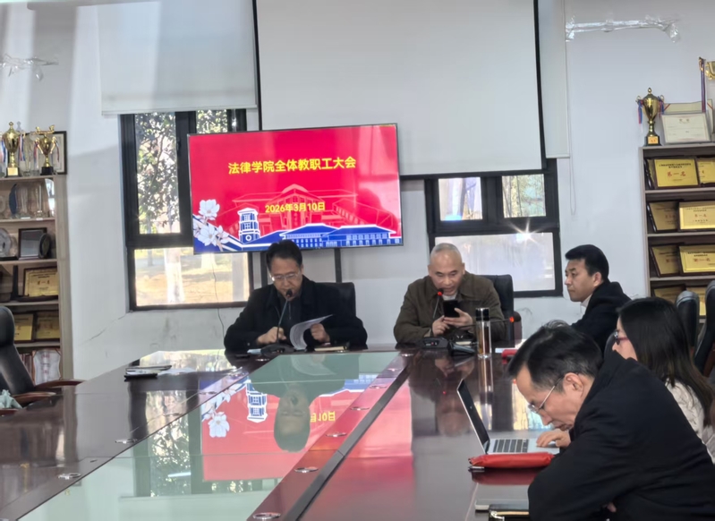 为压实工作责任、明晰发展路径,统筹推进新学期各项工作落地见效,3月10日,法律学院(调解学院)在B2-110会议室召开2026春季学期教职工大会。会议由学院党委副书记丁明强主持,学院党委书记彭辉、院长魏治勋出席会议并讲话,全体教职工参会。