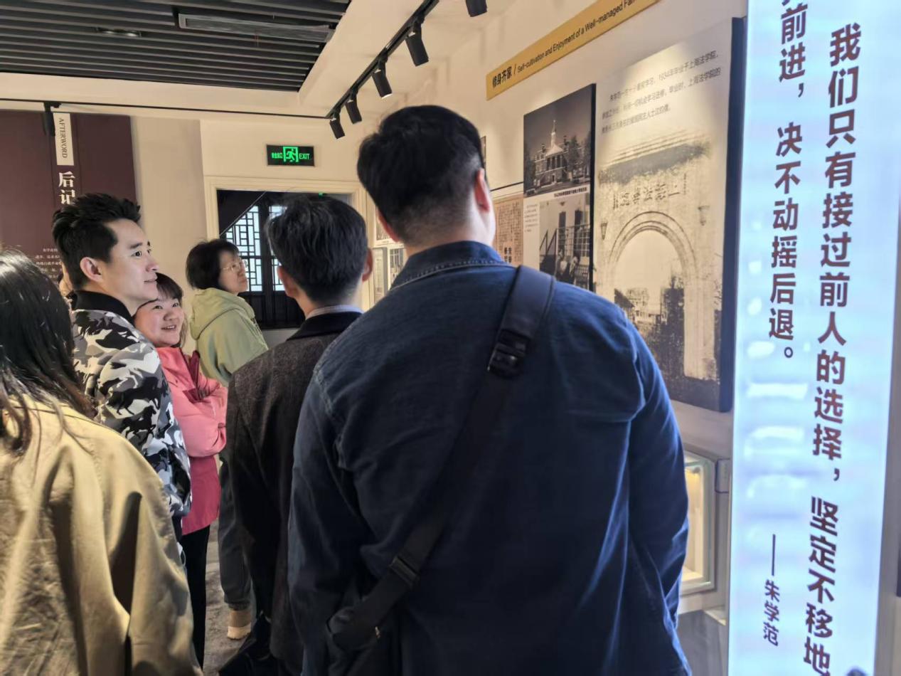 午餐过后,一行人前往有着“吴越名镇”美誉的枫泾古镇,开启水乡漫游之旅。作为典型的江南水乡,枫泾在细雨中更添水墨韵味,白墙黛瓦、小桥流水,一步一景皆是江南诗意。老师们先后参观了枫泾三桥等标志性景点,沉浸式感受古镇的历史底蕴与烟火气息;随后重点参观了朱学范故居,在专业导游的详细讲解中,深入了解朱学范先生为中国工人运动、人民邮电事业和统一战线作出的卓越贡献,在行走中感悟先辈精神,传承红色初心。