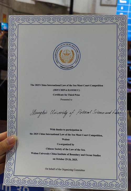 2025年10月27日,由中国海洋法学会、武汉大学中国边界与海洋研究院举办的“2025年中国国际海洋法模拟法庭(2025 China International Law of Sea Moot Court Competition, 2025 CHINA ILOSMCC)”比赛结果正式公布,我校代表队喜获三等奖。