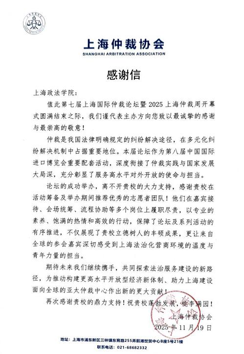近日,上海政法学院收到来自上海仲裁协会的感谢信。信中对我校志愿者在第七届上海国际仲裁论坛暨2025上海仲裁周开幕式中的专业服务给予高度评价,特别肯定了我校在持续深耕进博会法治服务、助力上海法治化营商环境建设中发挥的重要作用,字里行间满含对青年学子责任担当与专业素养的赞誉。