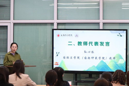 孙心依作为学院教师代表,分享了教学理念与育人经验。她以生动的案例引入,激发了同学们对涉外法学的学习兴趣。同时,她勉励新生重视英语学习、积极参与模拟法庭赛事,不断拓展法律知识,投身法律实践,努力成长为兼具家国情怀与专业素养的法律人。
