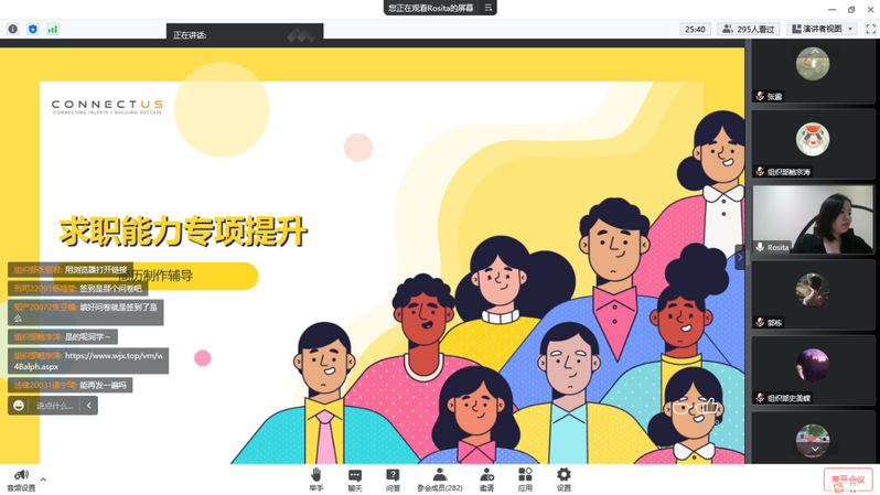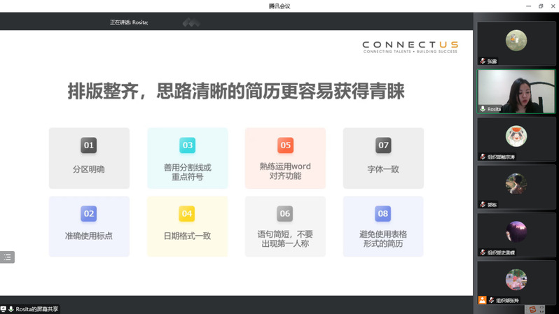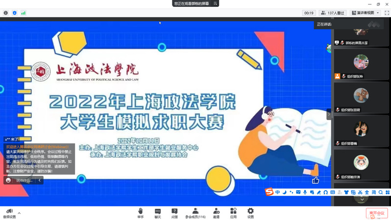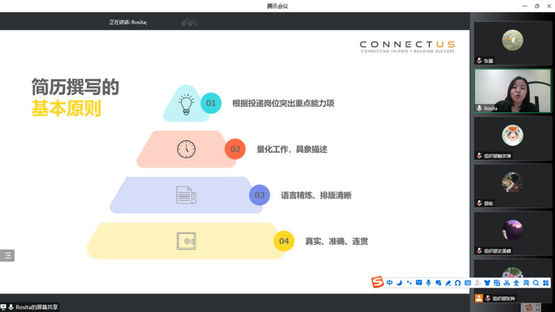 10月11日下午,我校通过腾讯会议启动2022年就业创业文化节系列活动之“秋招伴你行,求职技能大PK”上海政法学院大学生模拟求职大赛专项培训计划。上政校友、CONNECTUS GROUP校园关系经理王雪吟以“简历制作”为主题,指导我校学生提升求职技巧,吸引了300余名学生参与,学生工作部学生就业服务中心张露主持活动。
