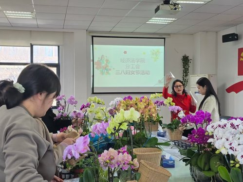 春光明媚,花香怡人。为庆祝第116 个“三八”国际劳动妇女节,3月 10日,经济法学院精心策划“巾帼绽芳华 花香润初心”蝴蝶兰主题插花活动,以实际行动彰显对女教职工的重视与关怀。学院领导、分工会主席全程参与,与全院女教职工齐聚一堂,共赴一场温馨雅致的花艺之约。