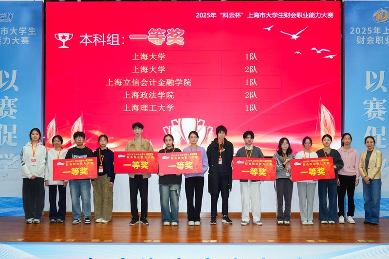 11月9日,由上海市教育委员会主办、上海立信会计金融学院承办的2025年“科云杯”上海市大学生财会职业能力大赛成功举办。比赛共有来自同济大学、上海大学、华东理工大学等18所上海本科院校的35支参赛队伍。我院选送的两支赛队在比赛中团结协作、沉着应对,展现出扎实的专业素养和职业能力,表现出色。由何佳妮、黄紫妍、邱钰淇、何奕臻组成的上政2队(指导老师:丁明强、黄慧)荣获上海市一等奖;由杨紫涵、白佳妮、李岫瑾、李昱儒组成的上政1队(指导老师:鲍长生、谢玮洁)荣获上海市二等奖。