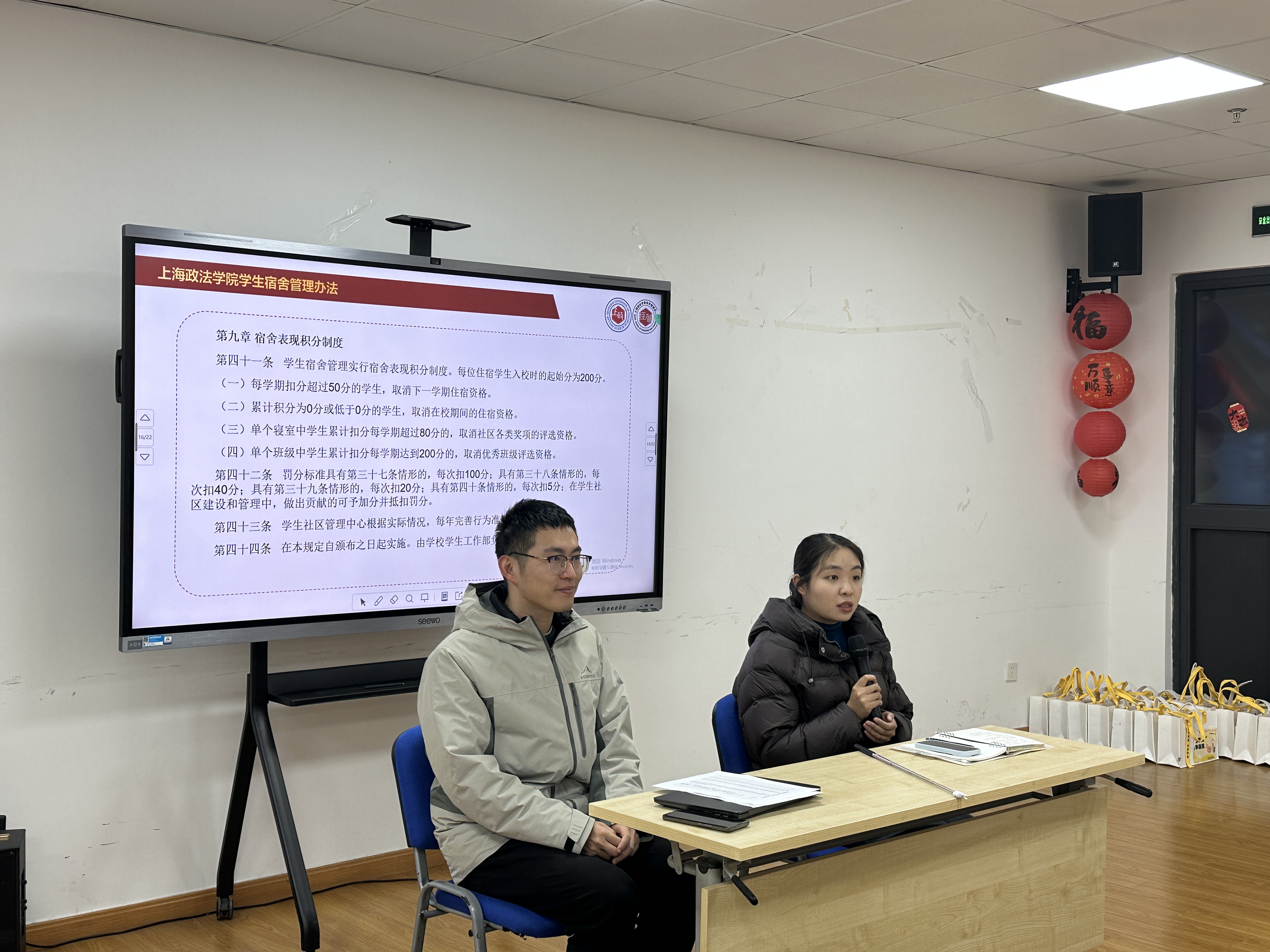 余佳瑞通报了学校冬季安全大检查反馈的问题。他要求全体社区骨干引以为戒,采取切实举措消除社区安全隐患,并就楼长、层长及安全委员在维护社区安全中的职责作了具体部署。他带领全体社区骨干学习了《上海政法学院学生宿舍管理办法》中的重点内容,并强调,学生骨干是社区管理的中坚力量,必须主动学习并熟练掌握宿舍管理相关制度,进一步增强责任意识,从严从实履行管理职责,带领全体同学共同营造安全、整洁、有序的住宿环境。