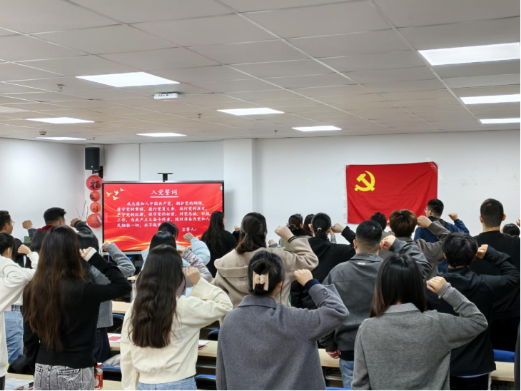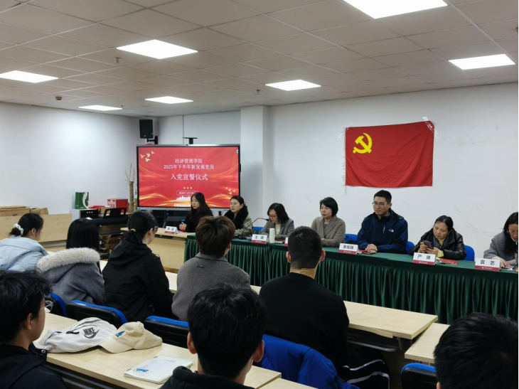 为深入学习贯彻习近平新时代中国特色社会主义思想,全面落实党的二十大和二十届四中全会精神,紧紧围绕新时代党的建设总要求,扎实推进以高质量党建引领思政育人工作,教育引导新发展党员牢记入党初心、锤炼坚强党性、筑牢信仰根基、践行使命担当。2025年12月25日中午,经济管理学院2025年下半年新发展党员入党宣誓仪式在E9-203会议室举行。经济管理学院学工负责人王颖、教工管理学党支部书记程利敏、党委组织员徐璐以及各本科生党支部书记出席了本次活动,2025年下半年新发展党员参加本次活动。仪式由上政第28学生党支部书记荣泽华主持。