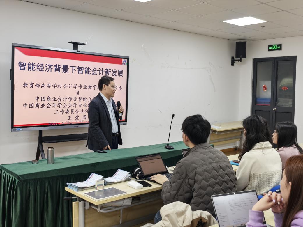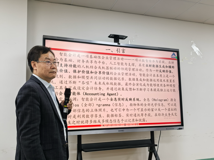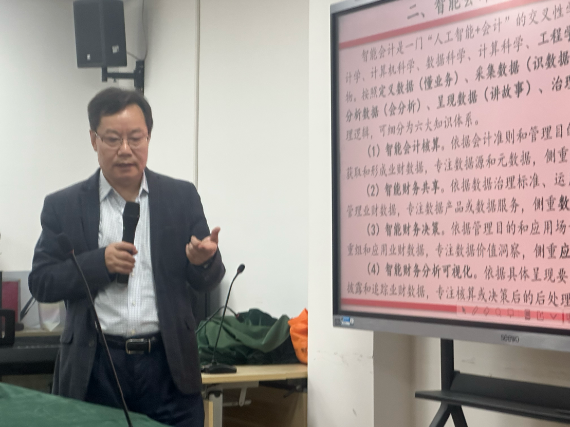 在此基础上,王爱国进一步详细介绍了智能会计的完整知识体系与实践内容。他系统讲解了智能会计核算、智能财务共享、智能财务决策、财务分析可视化、智能审计监督、智能会计伦理六大核心模块,让同学们对智能会计的整体框架有了清晰认知。同时他还提到,在智能会计的运行模式中,数据标签将逐步替代传统的记账凭证,数据中台成为重要支撑,在数字化转型的过程中,数据真实可信与业务逻辑严谨,是会计工作必须坚守的底线。