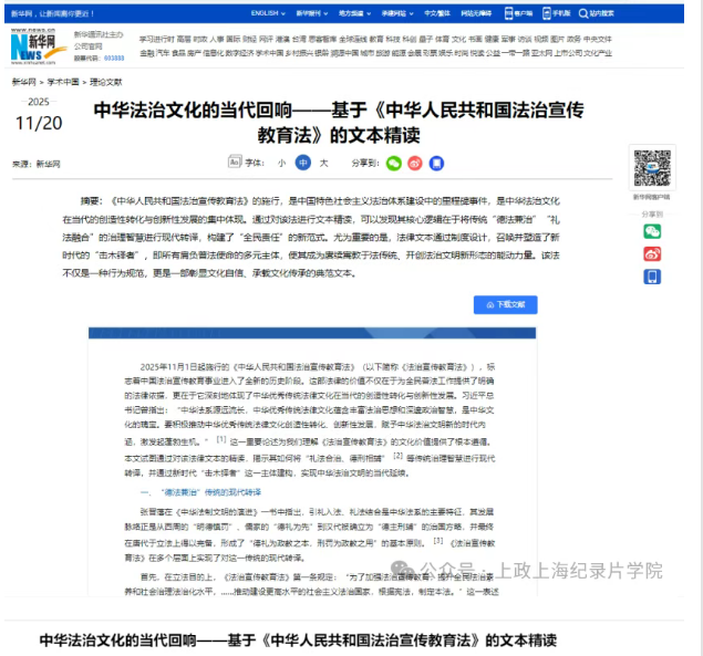 11月20日,新华社学术平台“学术中国”发表上海政法学院法治宣传教育学院郭炜华教授题为《中华法治文化的当代回响——基于〈中华人民共和国法治宣传教育法〉的文本精读》的学术论文。